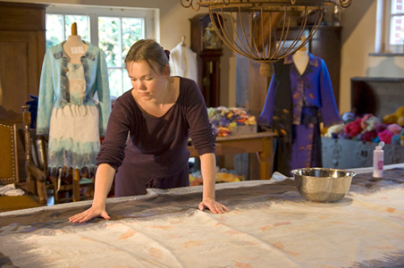 Zur Herstellung des Handfilzes beginne ich damit, Chiffonseide auf einer lang ausgelegten Folie auszubreiten. Behutsam lege ich dann die Merinowolle hauchdünn flächig oder in Mustern auf der Seide aus. Als leidenschaftliche Gärtnerin - immer wieder vom Wechselspiel der Natur und der Blütenpracht meines Gartens fasziniert - verwende ich mit Vorliebe florale Motive und Ornamente. Meine jahrelange Beschäftigung mit der Malerei erweist sich dabei als äußerst hilfreich und manchmal, besonders bei meinen Wandteppichen, entstehen dann auch Bilder aus dem Filz, die als solche gar nicht geplant waren. |